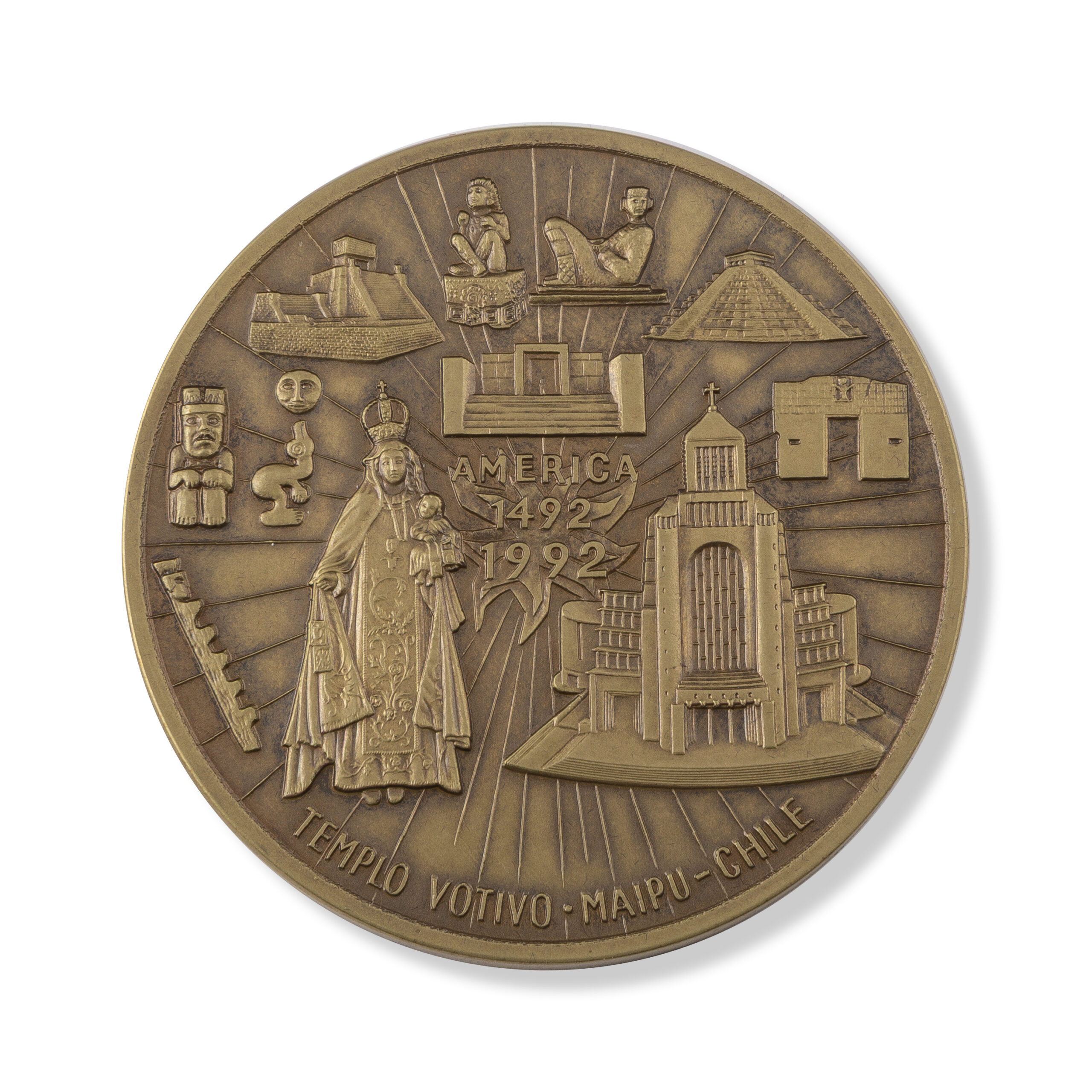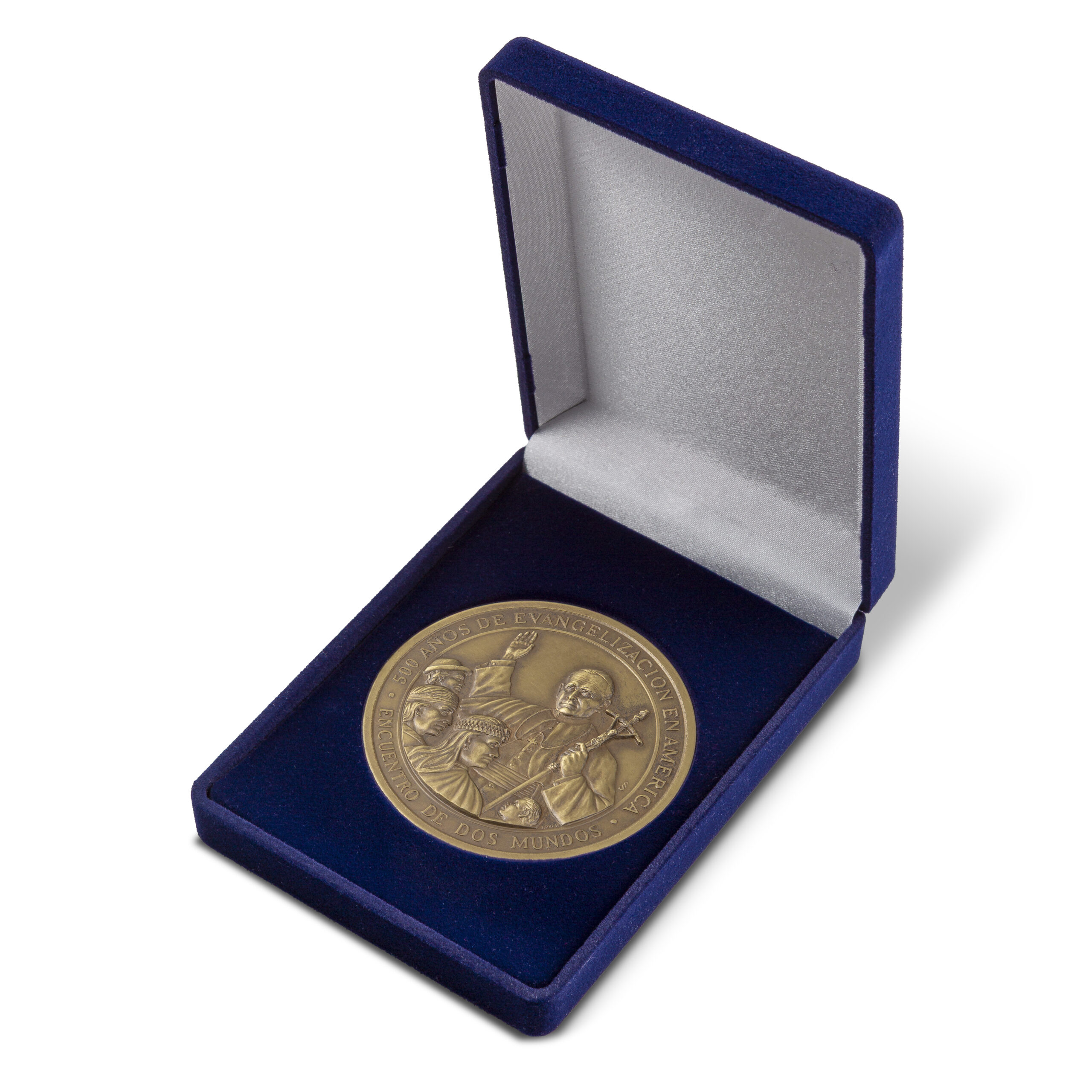 Medalla conmemorativa que recuerda los 500 años de evangelización en América, un acontecimiento histórico que marcó el encuentro entre distintas culturas y tradiciones del continente.
